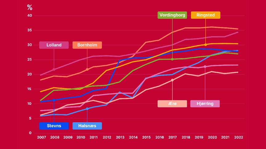 Det gælder også en række andre yderkommuner som eksempelvis Stevns, Vordingborg, Hjørring og Lolland, der også har oplevet en markant stigning i privatskoleandelen.
